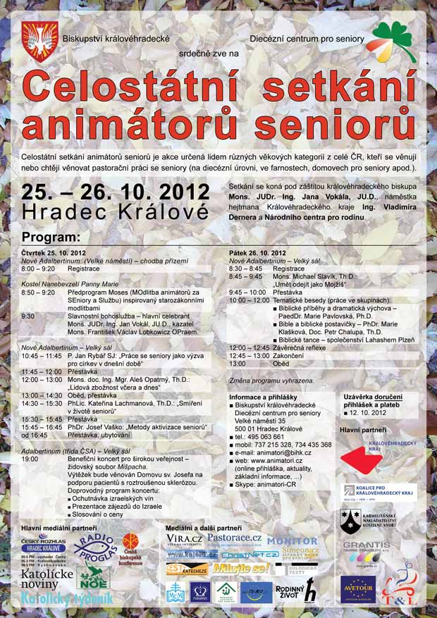 Diecézní centrum pro seniory Hradec Králové srdečně zve na již VI. ročník celostátního setkání animátorů seniorů, které se uskuteční 25. – 26. 10. 2012 v Hradci Králové.